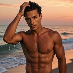 Right now on the beach under the sunset glow, he’s just come out of the sea wearing only soaked low-waist swim trunks, seawater tracing down his toned abs, sunlight gilding his body.